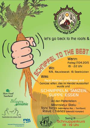Am Freitag, den 17. April 2015 veranstalten der Stadtbauernhof Saarbrücken e.V. und das Netzwerk Entwicklungspolitik im Saarland e.V. gemeinsam mit weiteren saarländischen Initiativen eine "Schnippeldisko" als Aktion gegen die tägliche Lebensmittelverschwendung. Anlass bietet der bundesweite Kochtag von BIOLAND und DER ZEIT.