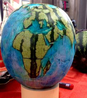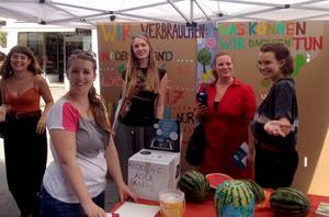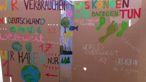 Bei der Aktion in der Bahnhofsstraße gab es unter anderem die Möglichkeit, den eigenen CO2- Fußabdruck zu berechnen, sich an der "Wand der Lösungen" zu beteiligen, Kreidebilder weiterzumalen, die Bodenzeitung zu entdecken - und eine wunderbar gestaltete Erdball-Melone zu bestaunen...