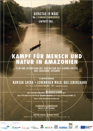 Am Dienstag, den 19. März um 18 Uhr zeigte das Netzwerk Entwicklungspolitik im Saarland e.V. zusammen mit mehreren Partnern den Kurz-Dokumentarfilm „Kawsak Sacha – Lebendiger Wald, das Lebenskanu“ im Filmhaus Saarbrücken (Mainzerstr. 8, 66111 Saarbrücken). Anschließend fand eine Diskussion mit Gästen des indigenen Volkes der Kichwa aus Sarayaku aus dem ecuadorianischen Amazonasgebiet statt.