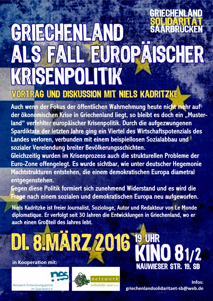 Auch wenn der Fokus der öffentlichen Wahrnemung heute nicht mehr auf der ökonomischen Krise in Griechenland liegt, so bleibt es doch ein "Musterland" verfehlter europäischer Krisenpolitik. Durch die aufgezwungenen Spardiktate der letzten Jahre ging ein Viertel des Wirtschaftspotenzials des Landes verloren, verbunden mit einem beispiellosen Sozialabbau un sozialer Verelendung breiter Bevölkerungsschichten.