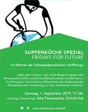 Im Rahmen der Schauspielproduktion »Hoffnung« bietet das Saarländische Staatstheater am Sonntag, den 1. September ab 17 Uhr in der Alten Feuerwache eine Suppenküche Spezial "Fridays for Future".