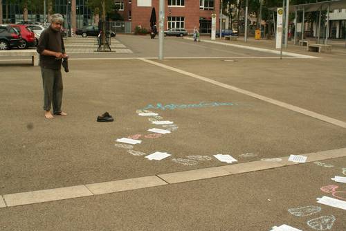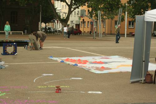 Die Stimmung war bestens, weil viele helfende Hände mit am Werk waren, um die Gedankenkarte anzufertigen. Insgesamt waren um die 300 Menschen über den Tag verteilt an der Aktion beteiligt, was bei der Wettervorhersage und doch herbstlichen Temperaturen als Erfolg angesehen werden kann . Auf dem Platz entstanden vier Kreidebilder, die von zwei tatsächlichen Fluchtgeschichten (Syrien und Afghanistan) ergänzt wurden.
