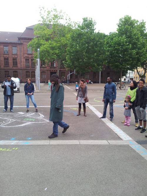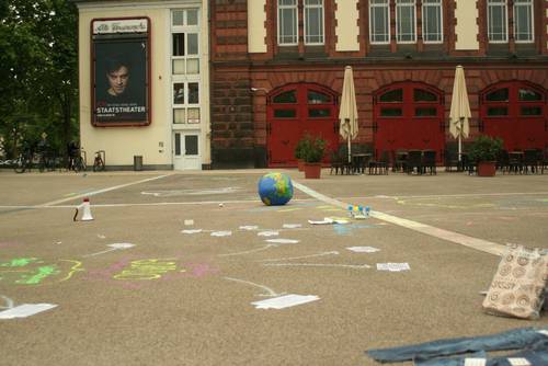 Ein weiterer Höhepunkt war das Guerilla-Theater von Eugen Georg, der gerade dabei ist ein Theaterstück mit Geflüchteten zu entwickeln. Unsere aufblasbare Weltkugel war bei dem Stück im Mittelpunkt und wurde unter lauten Rufen zwischen den Teilnehmenden hin und her geschossen, geschlagen und geworfen. In der Mitte befand sich der Staat, durch einen Teilnehmenden mit verbundenen Augen symbolisiert, der diesem Ball- und Worthagel standhalten musste bzw. ausgesetzt war. Ein interessantes Konzept das für viel Bewegung und Begeisterung sorgte und dennoch für das Thema sensibilierte.