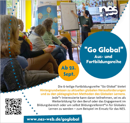 è Um als Bildungsreferent*in für Globales Lernen arbeiten zu können, ist ebenso die Teilnahme an den ersten drei Grundlagenseminaren sowie einem weiteren Seminar mit Praxiserprobung Voraussetzung. Außerdem sollte nach der Fortbildung mit erfahrenen Bildungsreferent*innen bei einem Bildungseinsatz des NES hospitiert werden.