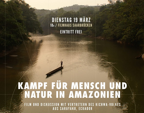 Der Film erzählt von der beeindruckenden, symbolischen Aktion des indigenen Volkes der Kichwa aus Sarayaku, die 2015 aus einem alten, auf ihrem Land gewachsenen Baum, ein Kanu bauten. Dieses brachten sie zur Weltklimakonferenz nach Paris, um damit auf den Schutz des Lebens im Amazonas-Gebiet aufmerksam zu machen.Zu Gast und bereit für die anschließende Diskussion waren zwei Vertreter des Kichwa-Volkes aus Sarayaku in Ecuador auf dem Podium. Eine einmalige Chance! Tupac Viteri Gualinga und Dionicio Machoa berichteten über ihren Kampf gegen große Ölkonzerne und für den Schutz ihres Landes und Territoriums in Amazonien. Ihre Botschaft: Wir müssen wieder ein Verständnis für den Schutz des Lebens und für naturbezogene Spiritualität entwickeln.