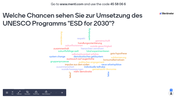 Das neue UNESCO Weltprogramm "ESD for 2030" wurde bei der Bildungstagung eingehend beleuchtet und mit Ansätzen der politischen, ökonomischen als auch der weltbürgerlichen Transformationsbildung zusammengebracht. In virtuellen Kleingruppen fanden Akteur:innen aus formalen wie nonformalen Bildungskontexten Gelegenheit über die Ansätze zu diskutieren und positive Entwicklungen zu benennen.