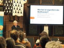 Tobias Reichert, Teamleiter für Welternährung, Landnutzung und Handel bei der Organisation Germanwatch e.V., ergänzte seinerseits die erste Präsentation mit einem Fokus auf gerechte und ungerechte Aspekte der Weltwirtschaft. Er hob hervor, dass das Welthandelssystem vor der Gründung der Welthandelsorganisation (WTO) für Entwicklungsländer zwar nicht gerecht, aber etwas fairer war als heute, weil es ihnen mehr Spielraum für eine eigene Entwicklungs- und Handelspolitik bot. Die Regeln des Allgemeine Zoll- und Handelsabkommen GATT ermöglichte ihnen damals einen verlässlichen Zugang auf Märkte der Industrieländer bei gleichzeitig flexibler Öffnung des eigenen Marktes. So konnten Länder wie Taiwan, Malaysia, Korea oder Singapur ihre eigene Industrie zunächst schützen und für den Export vorbereiten, bevor sie auf dem Weltmarkt Konkurrenz mit westlichen Firmen antreten mussten. Das ermöglichte ihnen sich mit internationalem Handel tatsächlich zu entwickeln. So könne man auch feststellen, dass eine weltweit faire Handelspolitik zwar keine Garantie für Erfolg auf dem Weltmarkt ist, diesen aber doch maßgeblich beeinflusst.